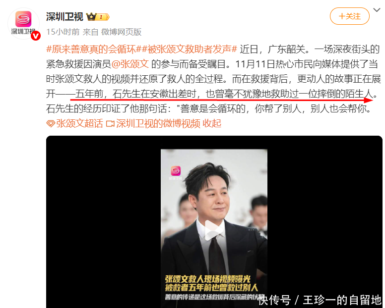 原本这件事情没有人知道,但出事男子得到救助后,他觉得这样的善意需要传递下去,于是发视频感谢了张颂文,而媒体也注意到了此事,进行了报道。